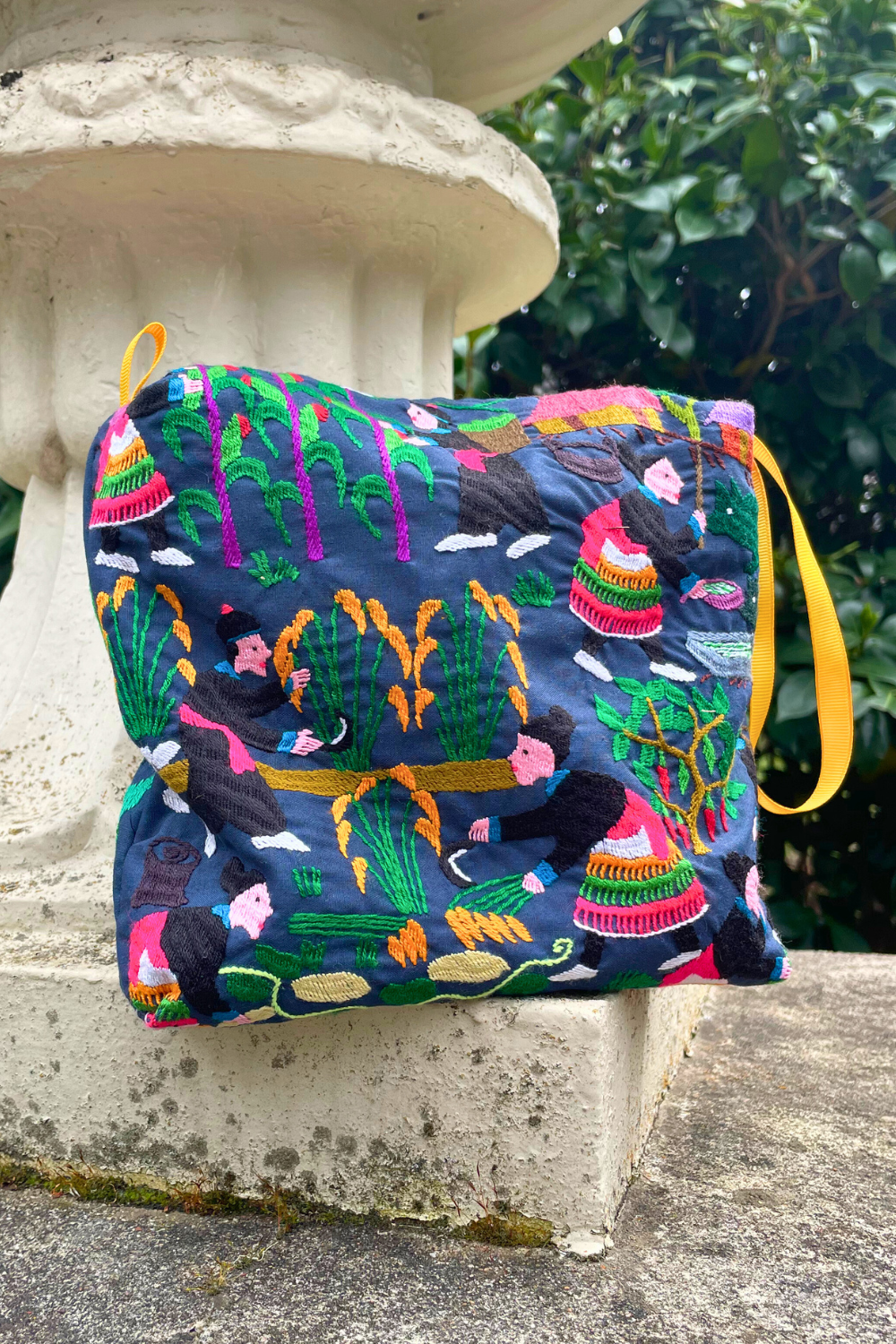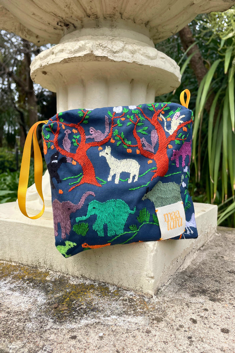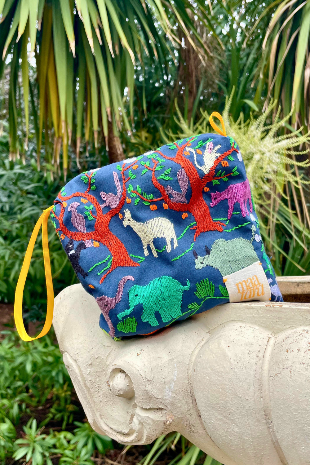 Hand-sewn box pouch made from embroidered cotton fabric sourced from Laos. Each piece features vibrant animal and nature motifs and is fully lined with cotton. Finished with a sturdy zip closure and side hang tape, perfect as a makeup bag, travel pouch, or everyday organizer.